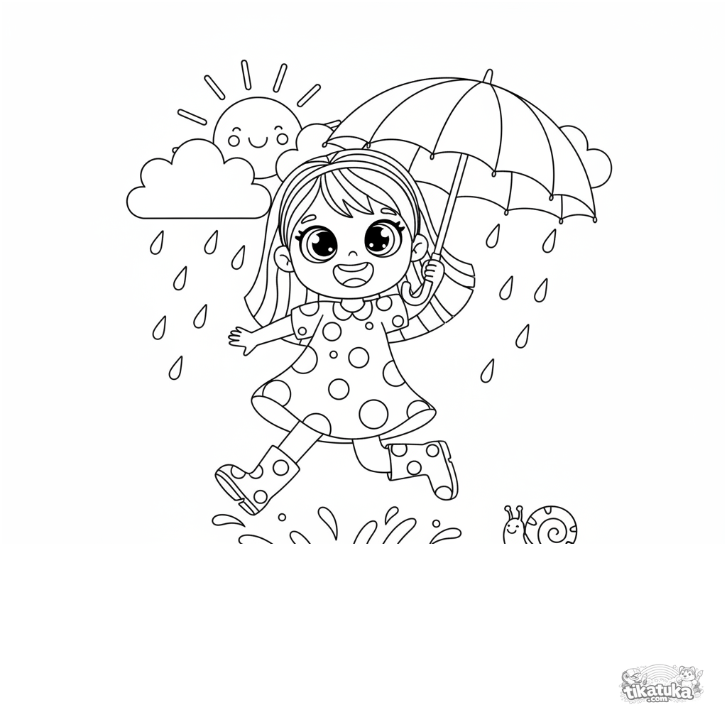 Ausmalbild eines fröhlichen Mädchens im Punktekleid, das in Regenpfützen springt. Für Mädchen von 3 bis 6 Jahren.