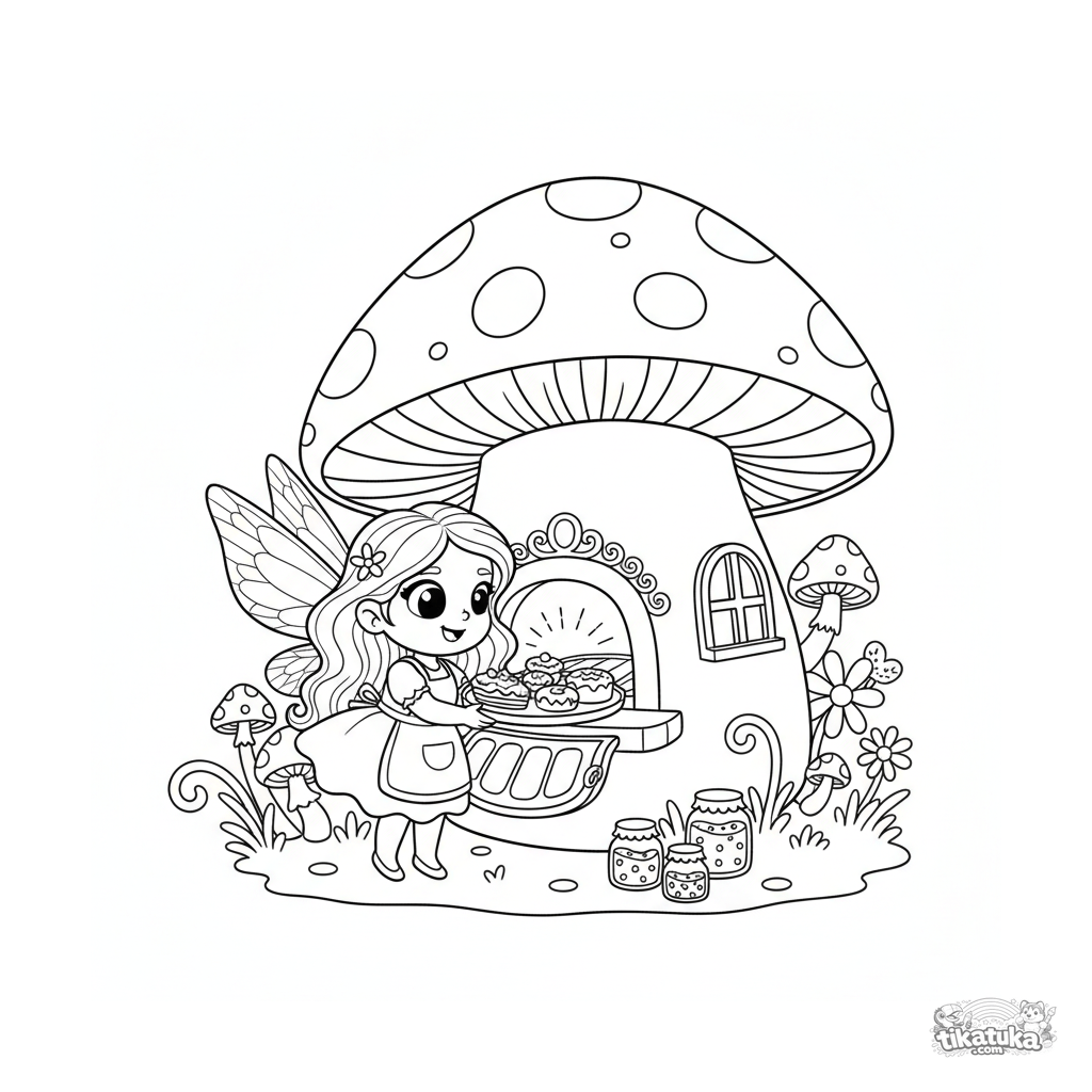 Ausmalbild für Kinder 4-6: Eine Fee backt magische Gebäckstücke in einem gemütlichen Pilzhaus. Niedliche Szene mit Details zum Ausmalen.