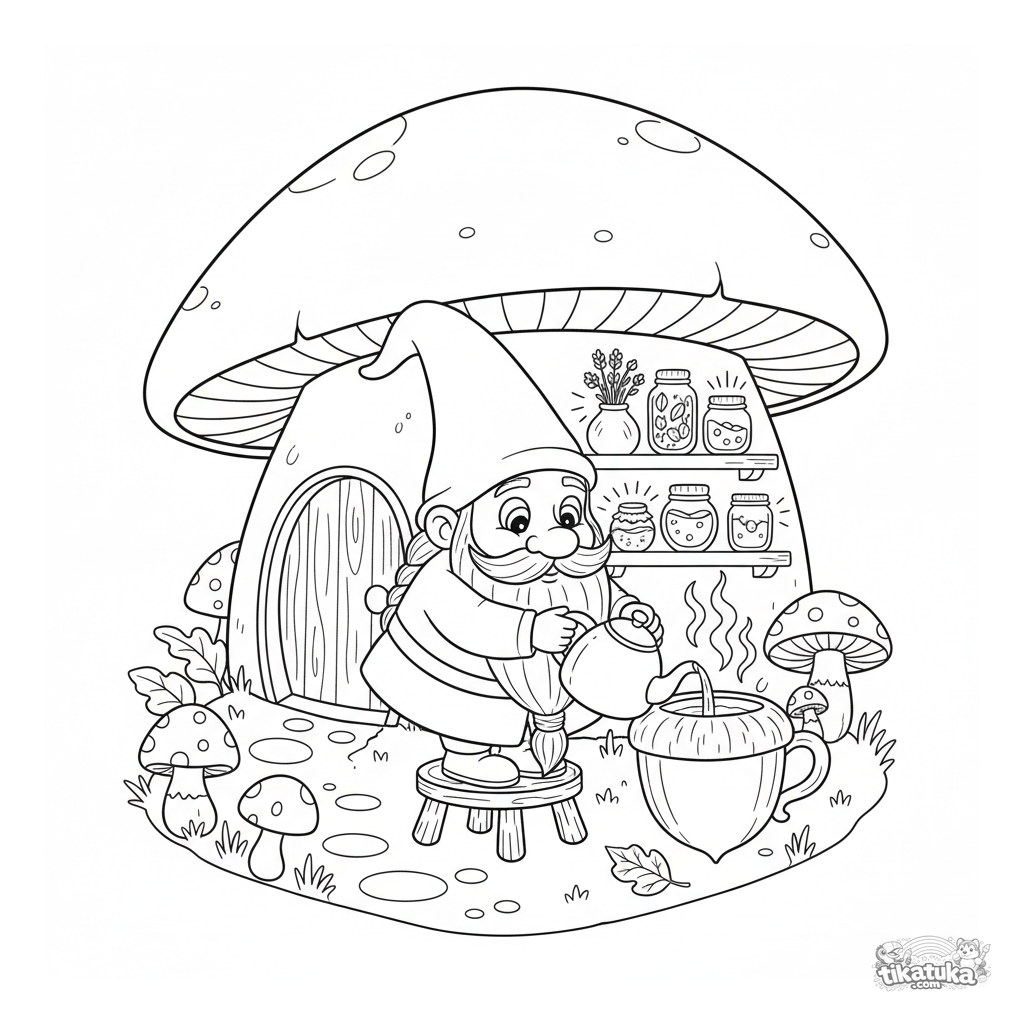 Ausmalbild für Kinder 4-6: ein Gnom kocht Tee in einem gemütlichen Pilzhaus. Niedliche Fantasieszene mit Details zum Ausmalen.