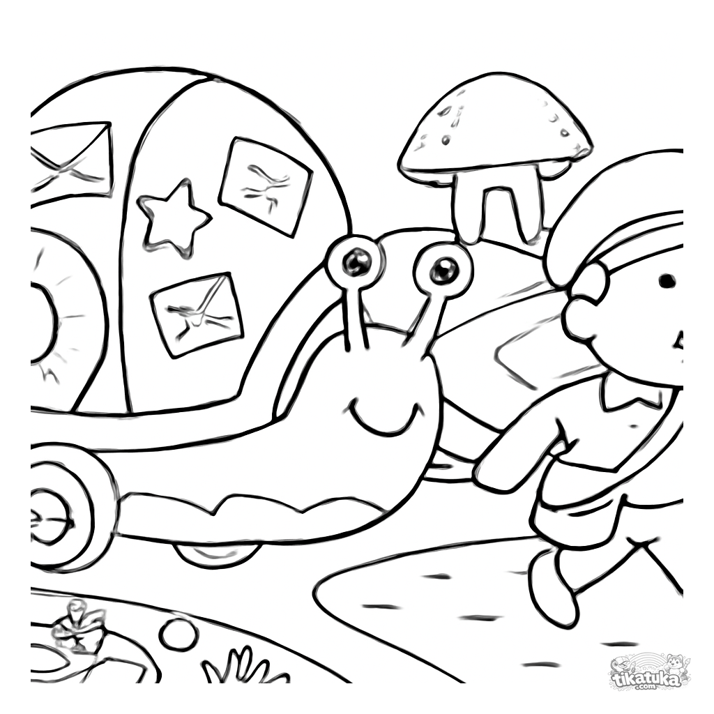 Einfaches Ausmalbild eines schneckenförmigen Postkarrens für Kleinkinder von 3-6 Jahren. Eine magische Schnecke liefert Post ab.