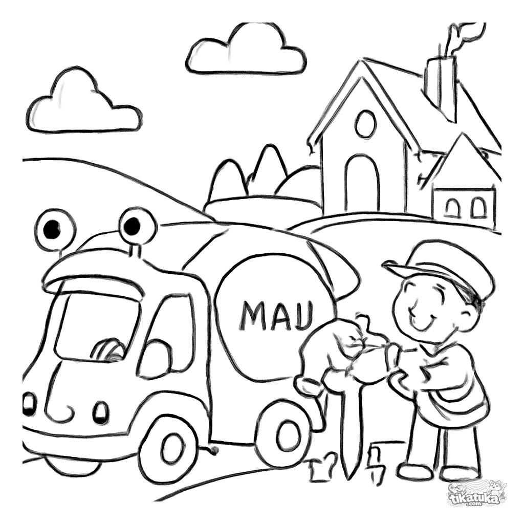 Lustiges Ausmalbild eines schneckenförmigen Postwagens für Kleinkinder von 2-5 Jahren. Einfache Zeichnung des vollständigen, kuriosen Fahrzeugs in einem Dorf.