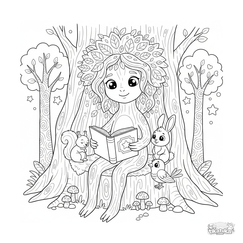 Ausmalbild für Kinder 4-6: Ein freundlicher, uralter Baum-Ent liest einem Eichhörnchen, einem Kaninchen und einem Vogel in seiner gemütlichen Höhle aus einem riesigen Buch vor.