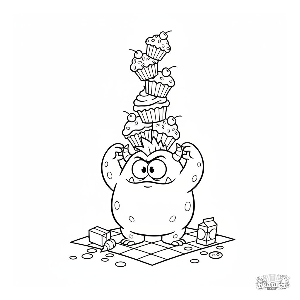 Ausmalbild für Kinder von 7-9 Jahren: Ein breites Monster im Hanna-Barbera-Stil balanciert ein Türmchen aus Cupcakes auf einem Picknick. Lustige und dynamische Szene.