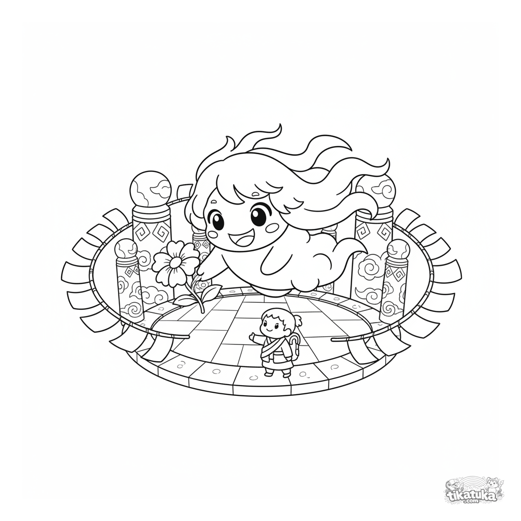 Ausmalbild für Kinder 5-9: Ein fröhlicher Windgeist hilft einem Reisenden in einem alten Bergtempel. Dynamische Linien und positive Szene zum Ausmalen.