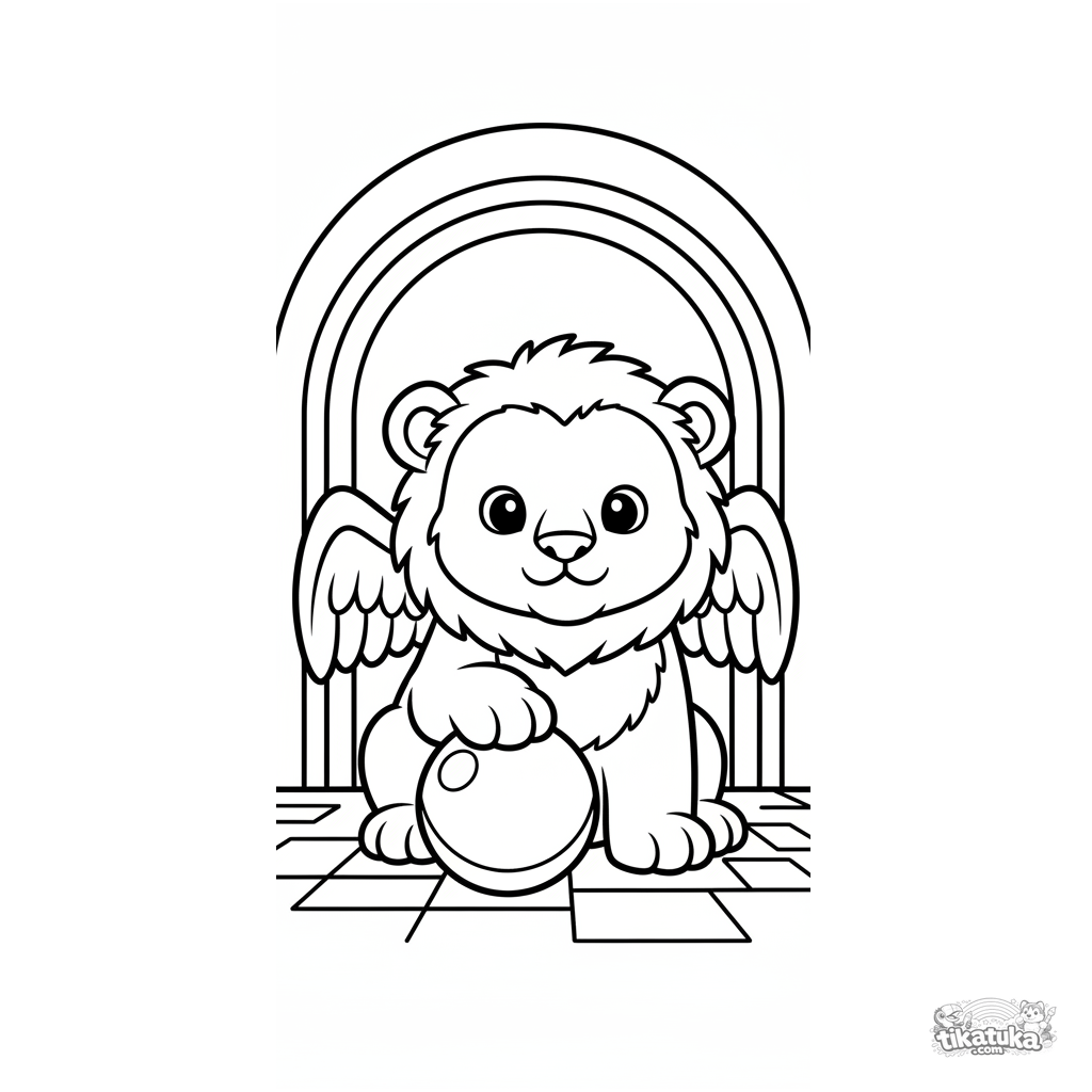 Einfaches Ausmalbild für Kleinkinder: Ein süßes geflügeltes Löwenjunges bewacht einen Labyrintheingang. Große klare Formen, geeignet für Kinder von 3-6 Jahren.