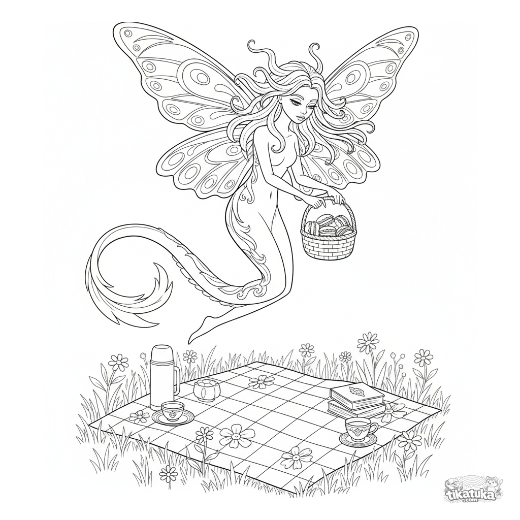 Komplexes Ausmalbild im Jugendstil für Kinder 10-12: Ein elegantes, geflügeltes Monster liefert einen Korb mit Makronen zu einem Picknick.
