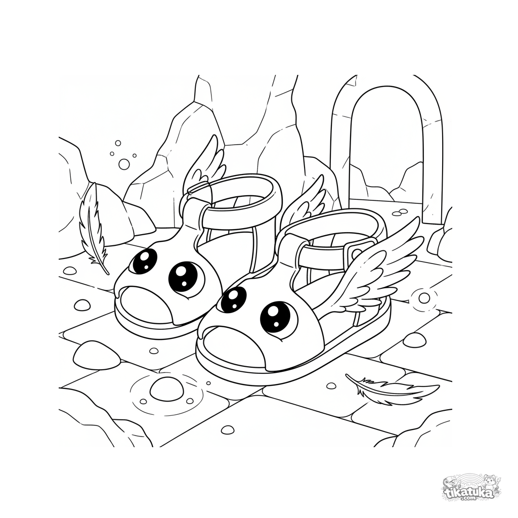 Ausmalbild für Kinder 4-6: magische geflügelte Sandalen auf dem Steinboden von Medusas Höhle. Klare Umrisse im Paper-Cut-Stil.