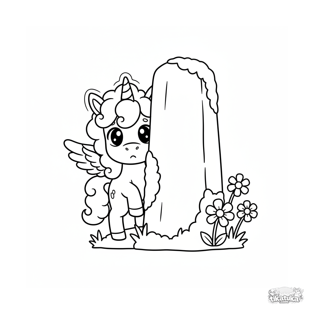 Ausmalbild für Kleinkinder: Ein niedliches, geflügeltes Einhorn-Fohlen lugt schüchtern hinter einem alten Monolithen hervor. Sehr einfache, große Umrisse zum Ausmalen.