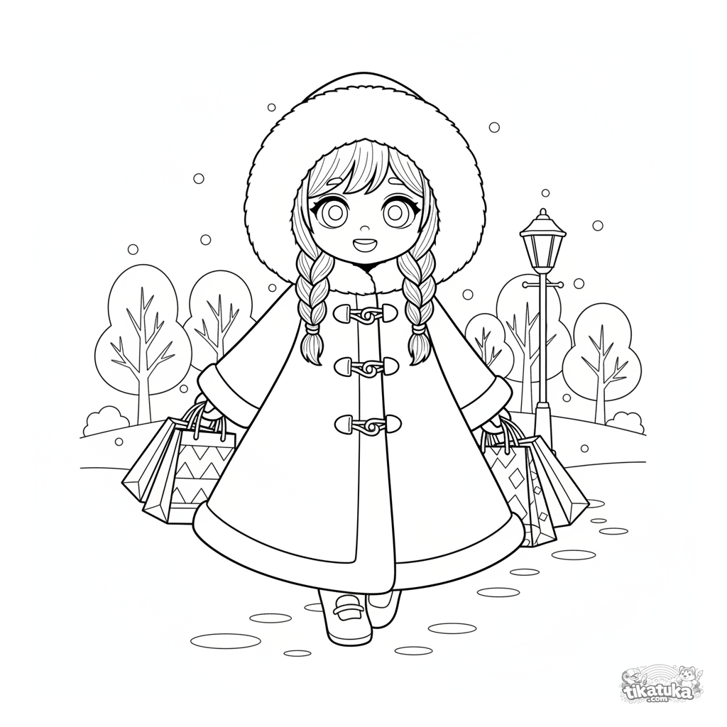 Ausmalbild für Mädchen 10-12: Gemütliches Winter-Outfit mit pelzbesetztem Mantel in einem schneebedeckten Stadtpark. Detaillierte Winterszene mit Straßenlaterne und Bäumen.