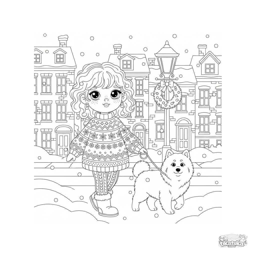 Komplexes Winter-Ausmalbild für Mädchen 10-12: Ein Mädchen in einem detaillierten Fair-Isle-Sweaterkleid geht mit ihrem Hund eine verschneite Straße entlang. Viele Winterstadtelemente und komplexe Strickmuster.