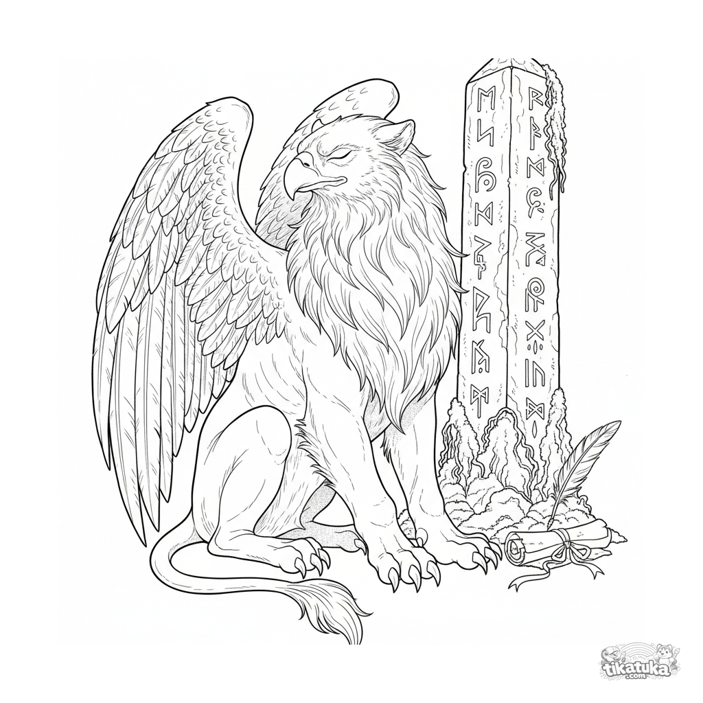 Kompliziertes Ausmalbild für 10-12 Jahre: Ein weiser alter Greif im Stil eines antiken Stichs ruht bei einem moosbedeckten Runenmonolithen. Detaillierte Szene mit historischer Stimmung.