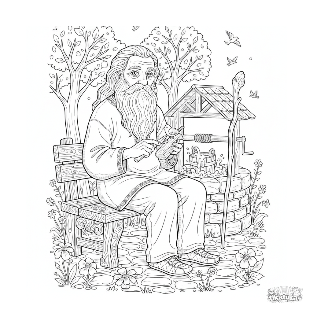Ausmalbild für Kinder 10-12: Ein weiser alter Wächter sitzt am Brunnen mit lebendigem Wasser und schnitzt eine Figur. Detaillierte Szene im Stil eines alten Stichs.
