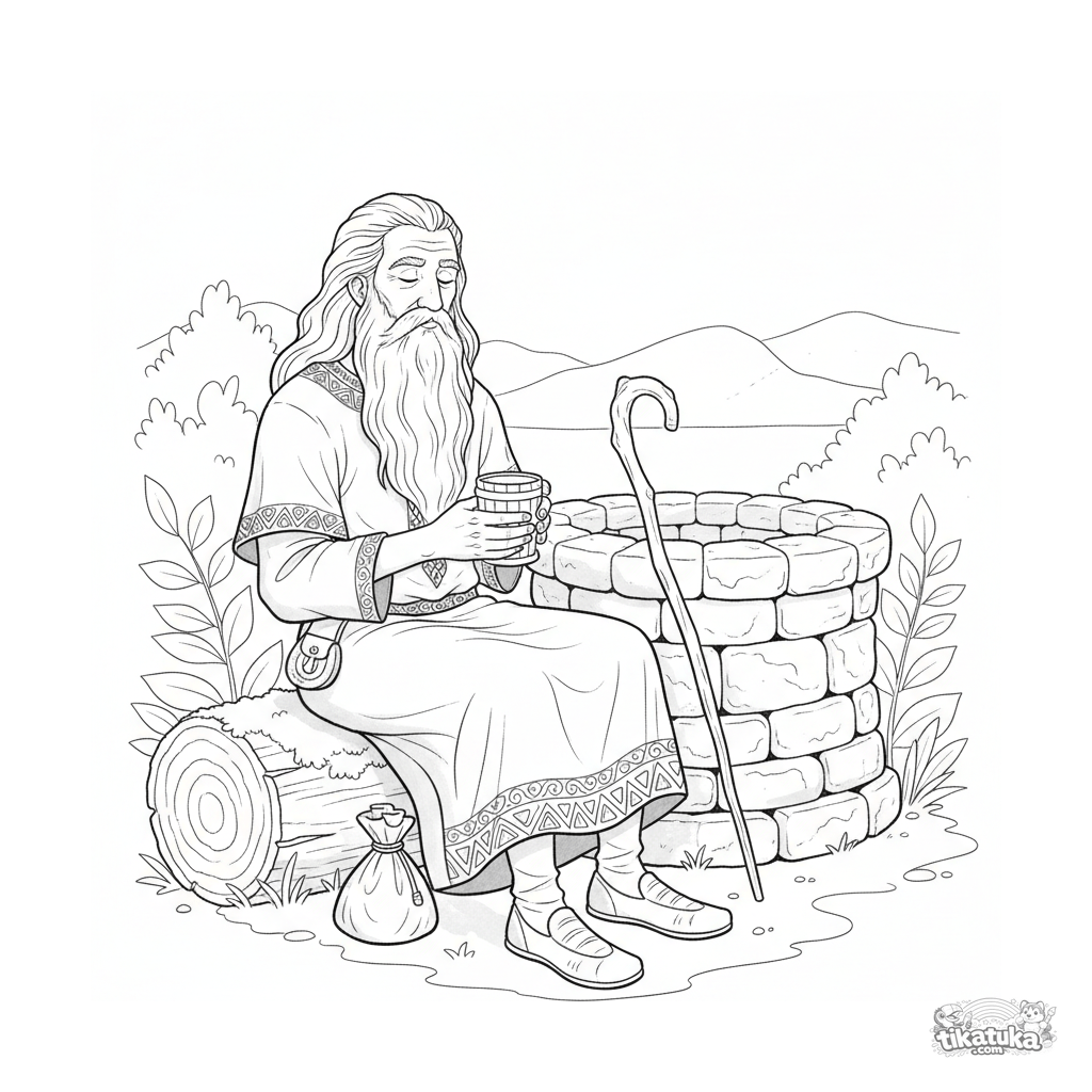 Ausmalbild für ältere Kinder 10-12: Ein weiser Ältester ruht an einem uralten Brunnen. Detaillierte Szene zum Ausmalen mit friedlichen, nachdenklichen Tönen.