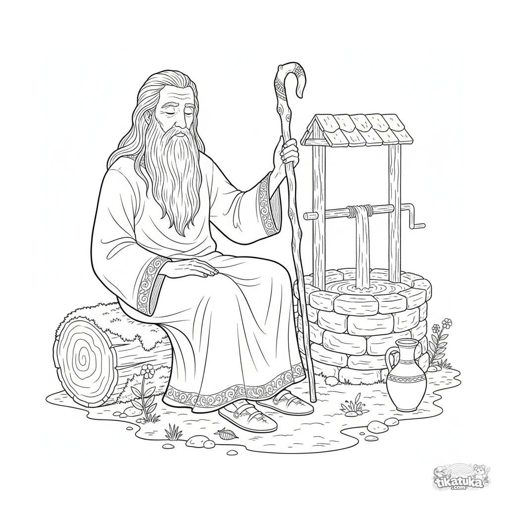 Ausmalbild für 10-12 Jahre: Ein weiser Ältester ruht am Brunnen mit lebendigem Wasser. Detaillierte Illustration im Stil eines alten Stichs, inspiriert von Folklore.