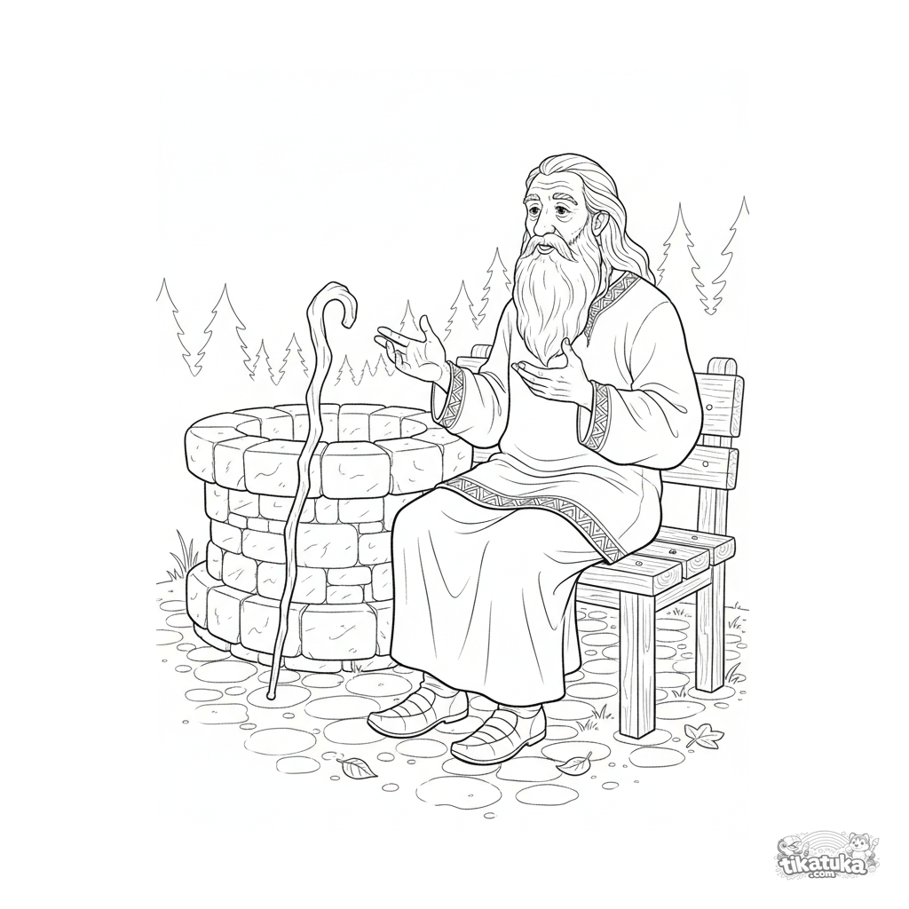Ausmalbild für ältere Kinder 10-12: Ein weiser Ältester erzählt Geschichten am Brunnen des lebendigen Wassers. Detaillierte Szene im realistischen Stil.