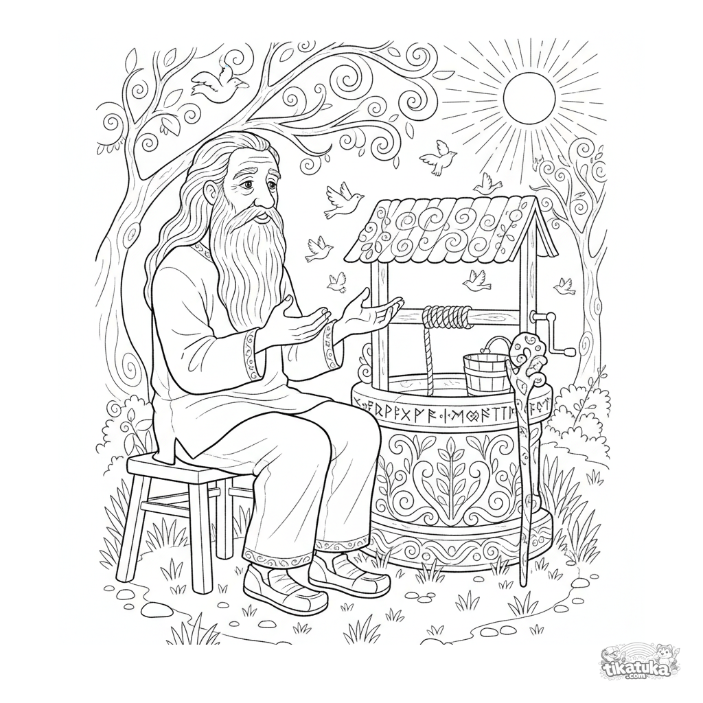 Ausmalbild für 10-12 Jahre: Ein weiser Ältester am Brunnen mit lebendigem Wasser erzählt ein Volksmärchen. Detaillierte Szene im realistischen Skizzenstil.