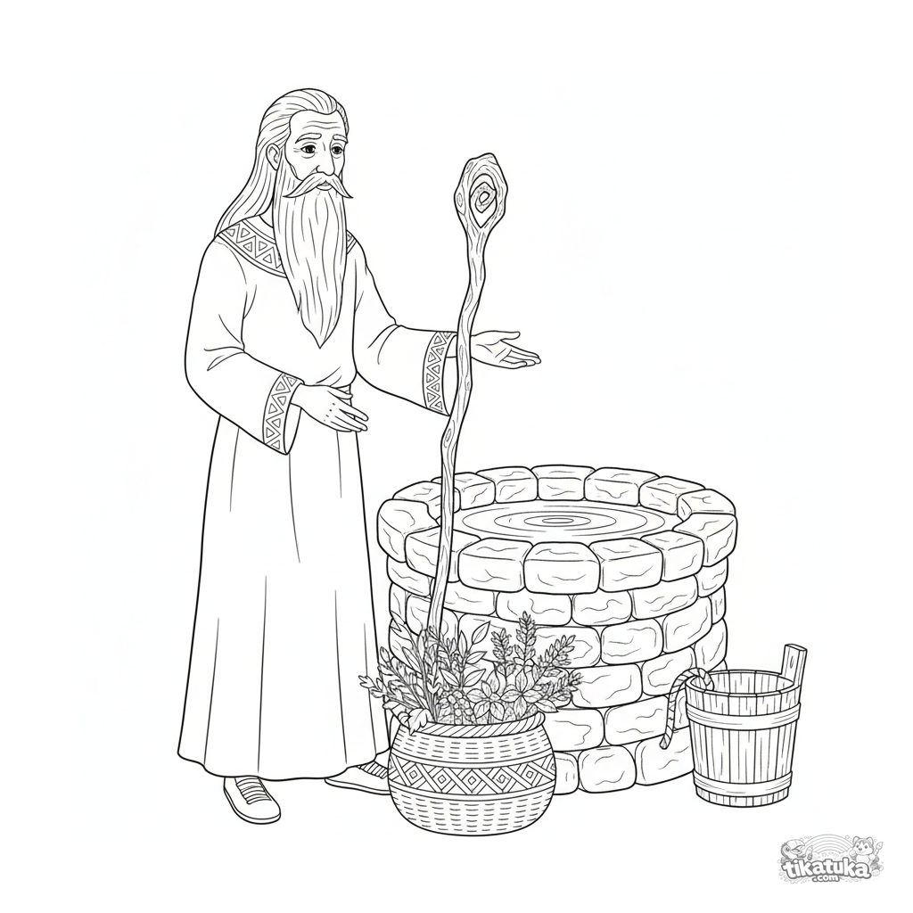 Ausmalbild für 10-12 Jahre: ein weiser Hüter an einem alten Brunnen mit lebendigem Wasser. Detaillierte Linien, realistische Züge, folkloristische Atmosphäre.