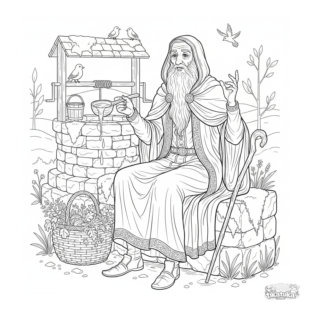 Ausmalbild für ältere Kinder 10-12: Ein weiser Geschichtenerzähler an einem Brunnen mit lebendigem Wasser. Detaillierter Gravurstil, Szene zentriert.