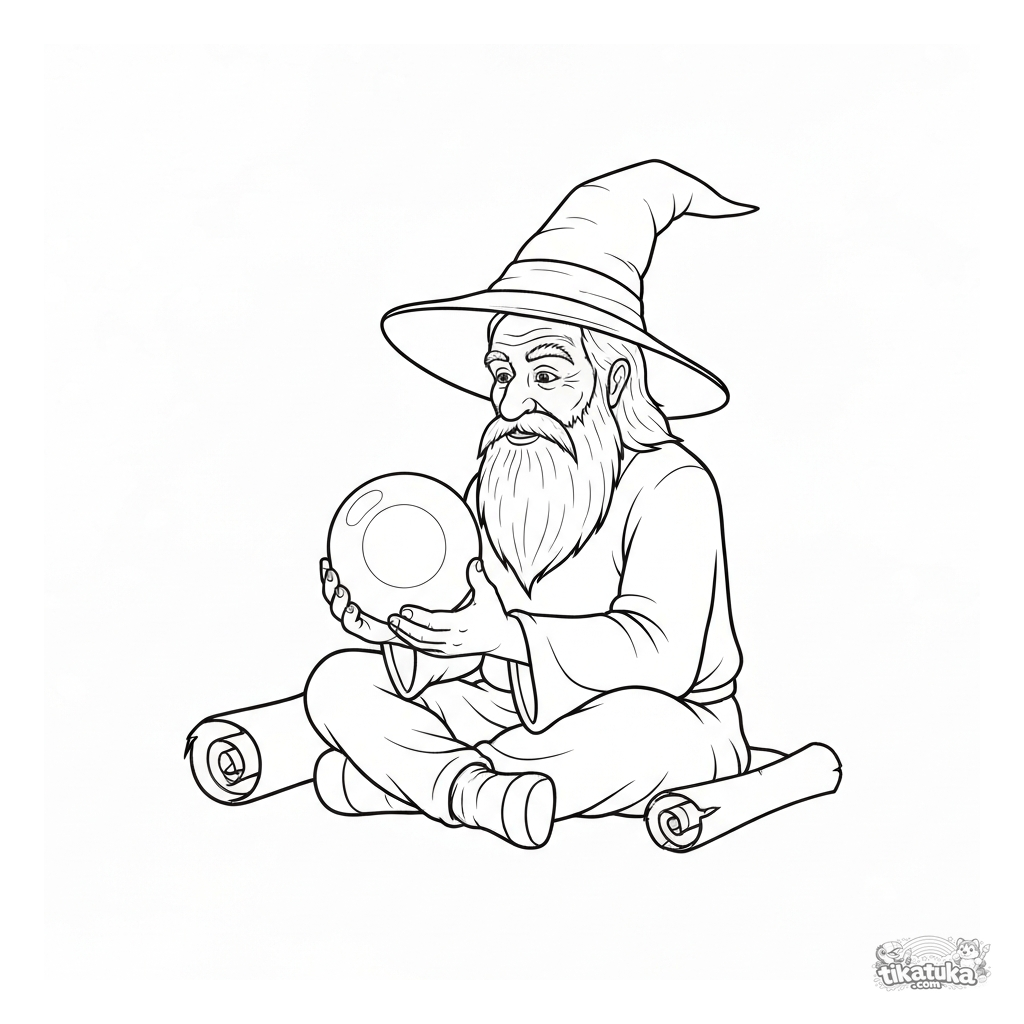 Ausmalbild eines weisen alten Zauberers, der eine leuchtende Kristallkugel hält. Interessante und einfache Szene für Kinder von 3-5 Jahren.