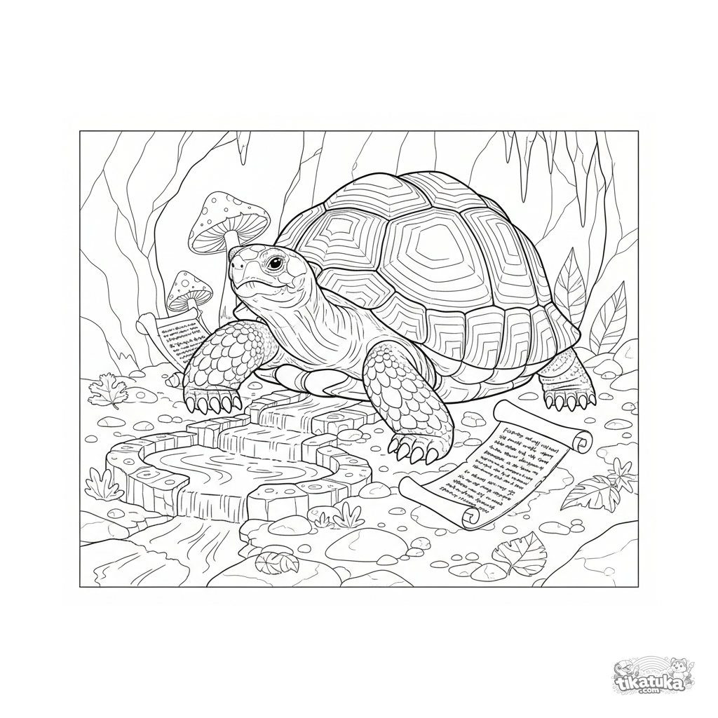 Ausmalbild für 4-6 Jahre: Ein weises Schildkröten-Orakel sitzt an einer Quelle in der Gorgonenhöhle. Klare Umrisse, mäßige Details.