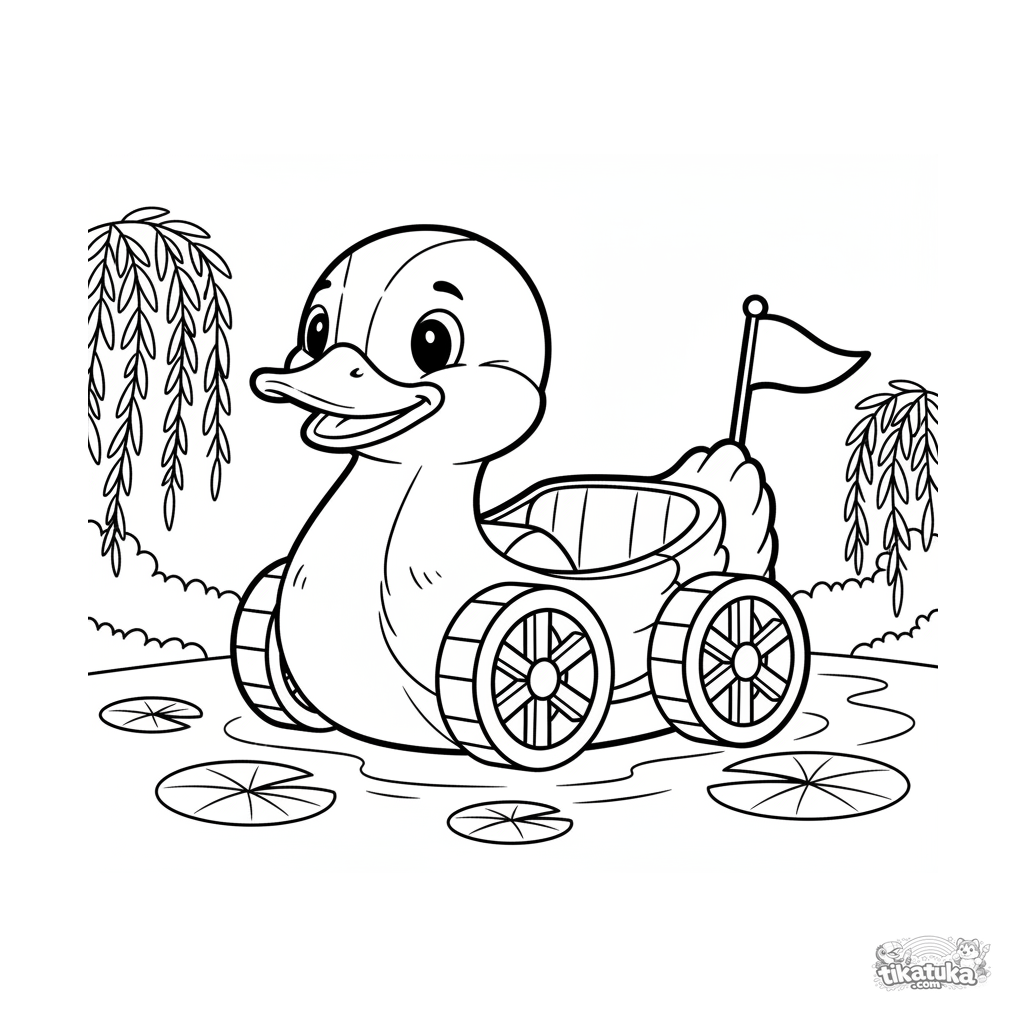 Ausmalbild für Kleinkinder 2-3 Jahre: ein fröhliches Enten-Tretboot auf einem ruhigen Parkteich. Einfache Formen.