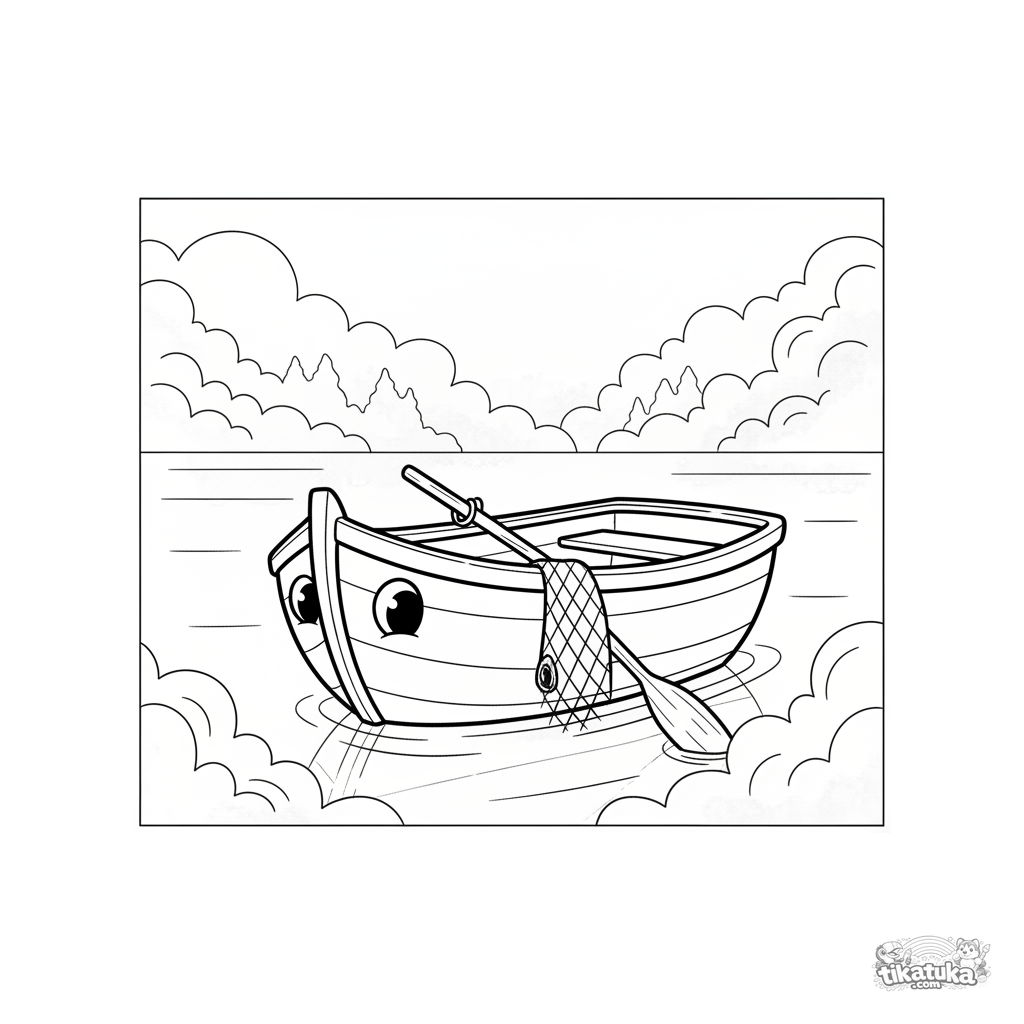 Ausmalbild für Kinder 4-6: Ein hölzernes Fischerboot treibt im stillen Morgennebel auf einem ruhigen See. Einfache Formen, klare Szene.