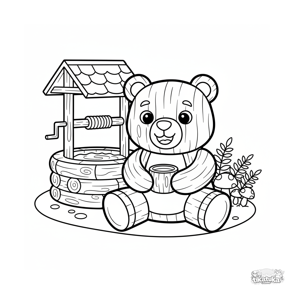 Einfaches Ausmalbild für Kleinkinder 2-3: Ein freundlicher Holzbär sitzt am Brunnen. Große klare Formen, wenige Details, perfekt für erste Buntstifte.