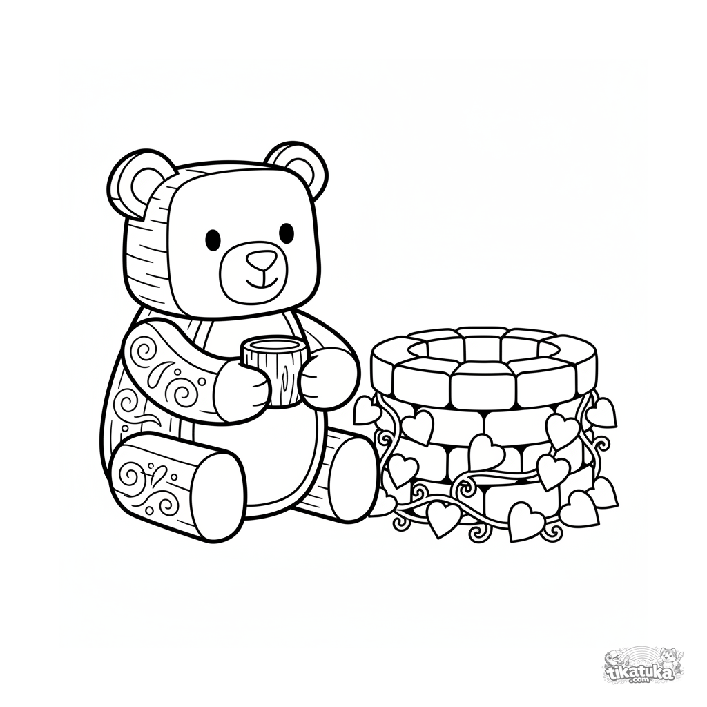 Einfaches Ausmalbild für Kleinkinder 2-3: Ein freundlicher Holzbär-Wächter sitzt an einem Steinbrunnen mit lebendigem Wasser. Große klare Formen, wenige Details.