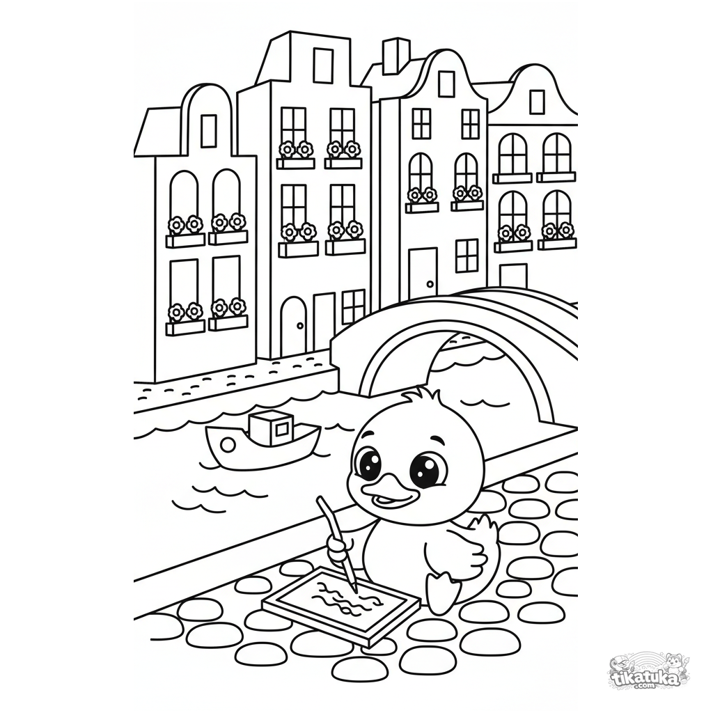 Kleinkind-Ausmalbild 2-3: eine gemütliche Kanalstraße mit Häusern, ein Entlein, das mit Kreide zeichnet. Große einfache Formen wie Holzspielzeug, sehr breite Ränder.