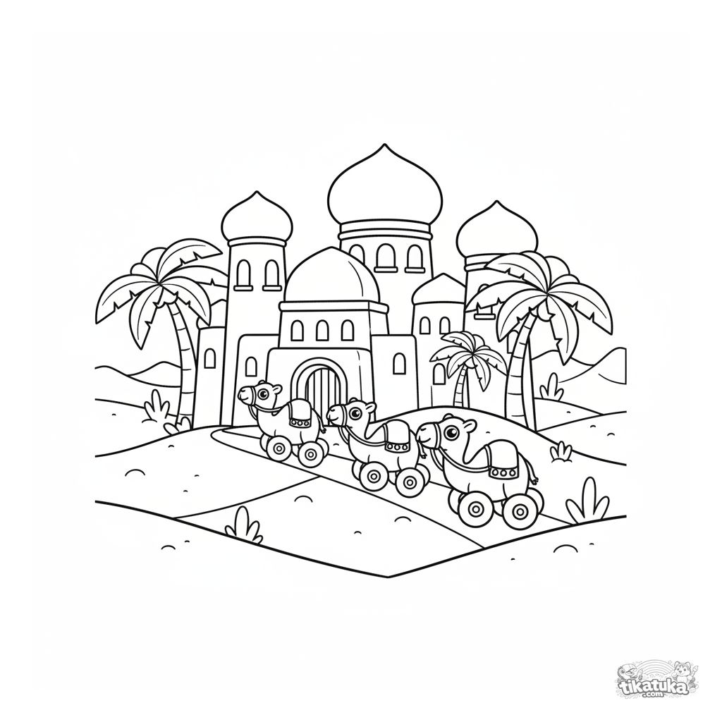 Holzspielzeug-Stil Ausmalbild eines Wüstenpalasts für Kinder von 4-7 Jahren. Mit Palast mit Kuppeltürmen, einer Kamelkarawane und Palmen.