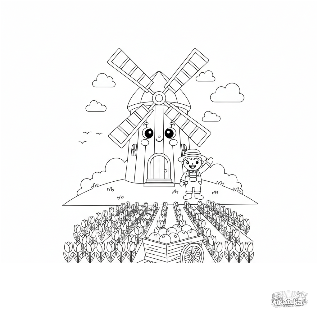 Holzspielzeug-Stil Ausmalbild einer Windmühle auf einem Hügel für Kinder von 4-7 Jahren. Mit sich drehender Windmühle, Tulpenfeld, Karren und winkendem Bauer.