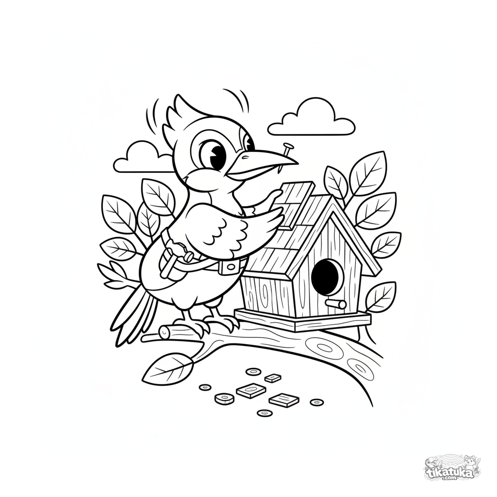 Ausmalbild für Kinder 7-9: ein Specht repariert als Zimmermann das Dach eines Vogelhauses. Lustige Szene mit Werkzeugen und einem Nagel im Schnabel.