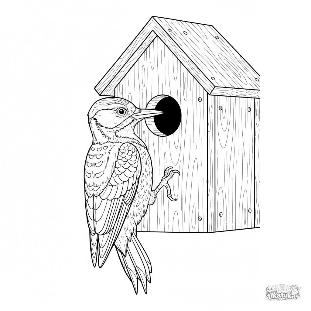 Detailliertes Ausmalbild für Kinder 10-12: ein gefleckter Specht klammert sich an die Vorderseite eines Holz-Vogelhauses und studiert aufmerksam das Einflugloch. Realistische Holz- und Federtexturen.