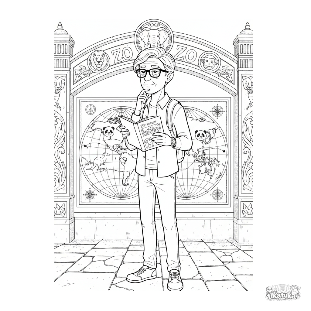 Ausmalbild für Kinder 10-12: Ein Student studiert eine Weltkarte am Zooeingang, die zeigt, woher verschiedene Tiere stammen. Lehrreiche Geographieszene.