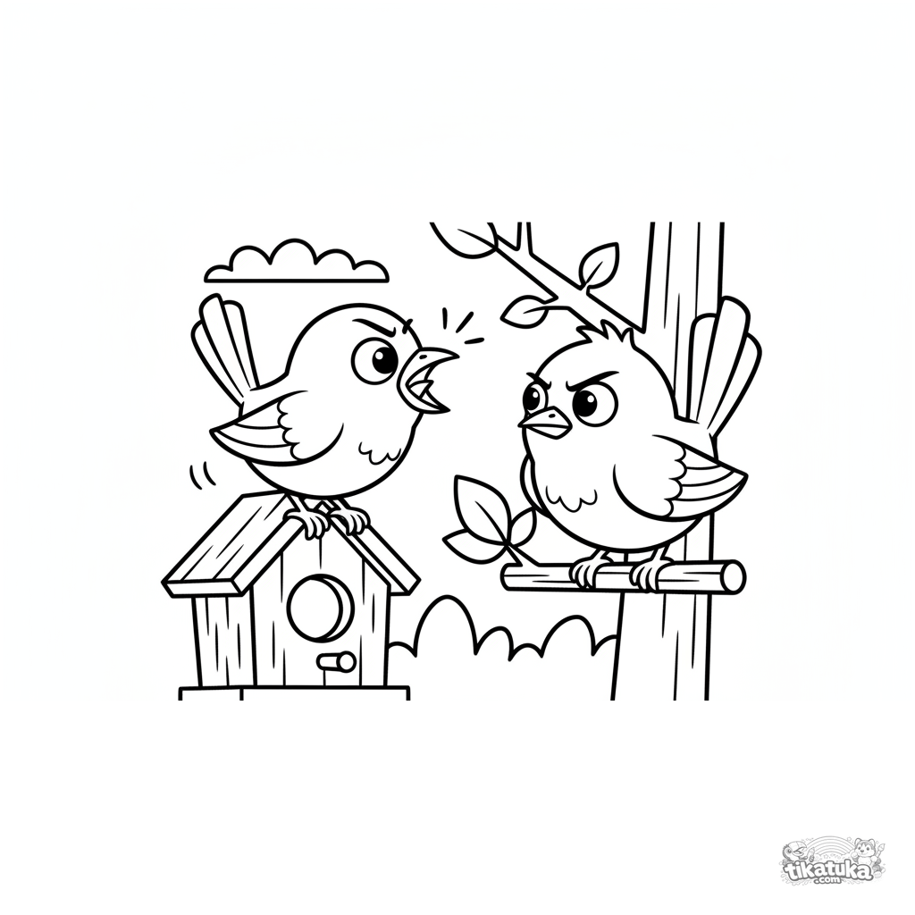 Ausmalbild für Kinder 7-9: zwei lustige Zaunkönige haben einen lebhaften Streit auf der Stange vor einem Vogelhauseingang. Ausdrucksstarke Posen und Emotionen.