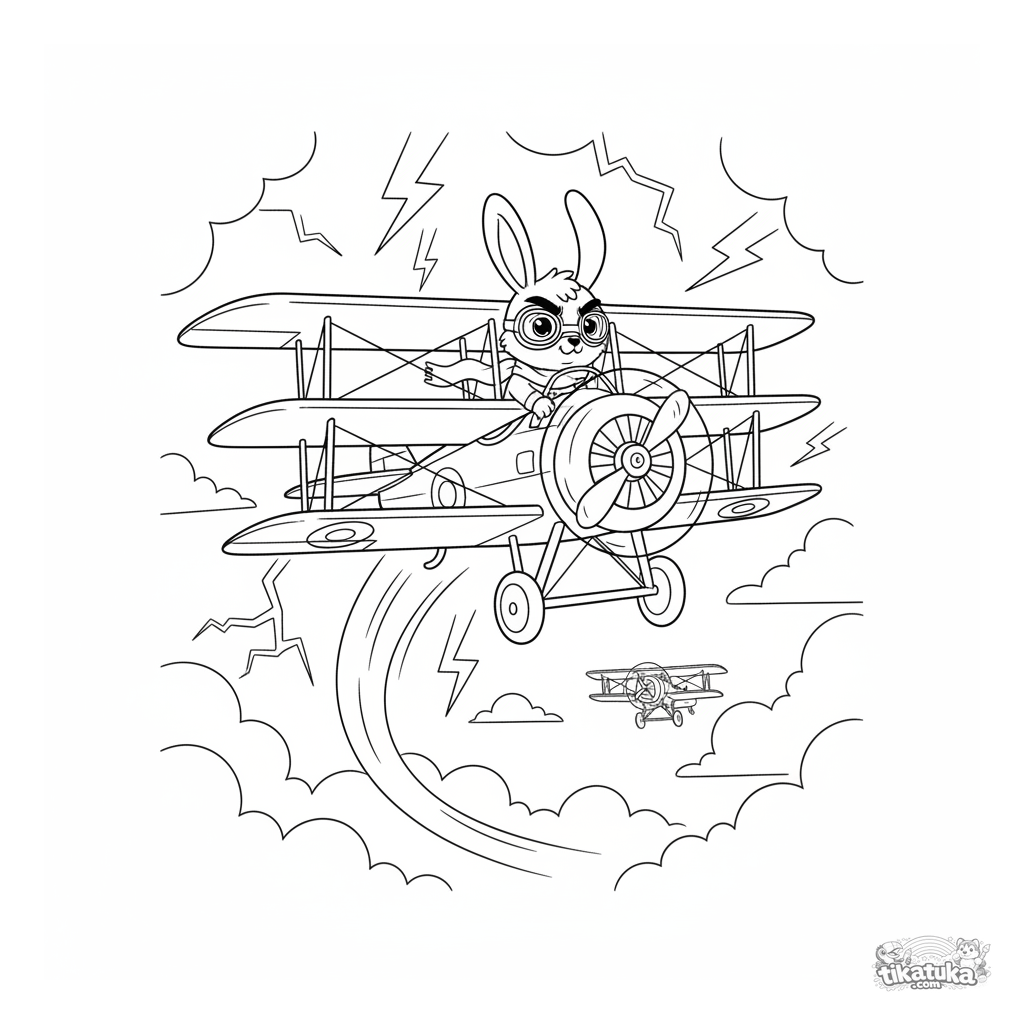 Ausmalbild für 7-9 Jahre: Ein Dreidecker aus dem Ersten Weltkrieg zieht eine Schleife in einem stürmischen Himmel. Dynamische Actionszene.