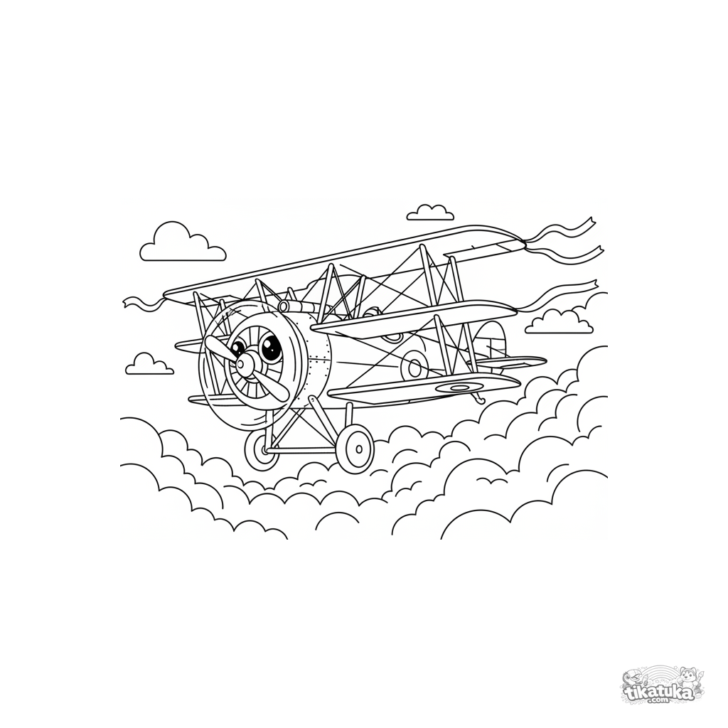 Ausmalbild für Kinder 7-9: Ein WWI-Dreidecker in einer dynamischen Kurve durch flauschige Wolken. Comic-Abenteuer-Stil.