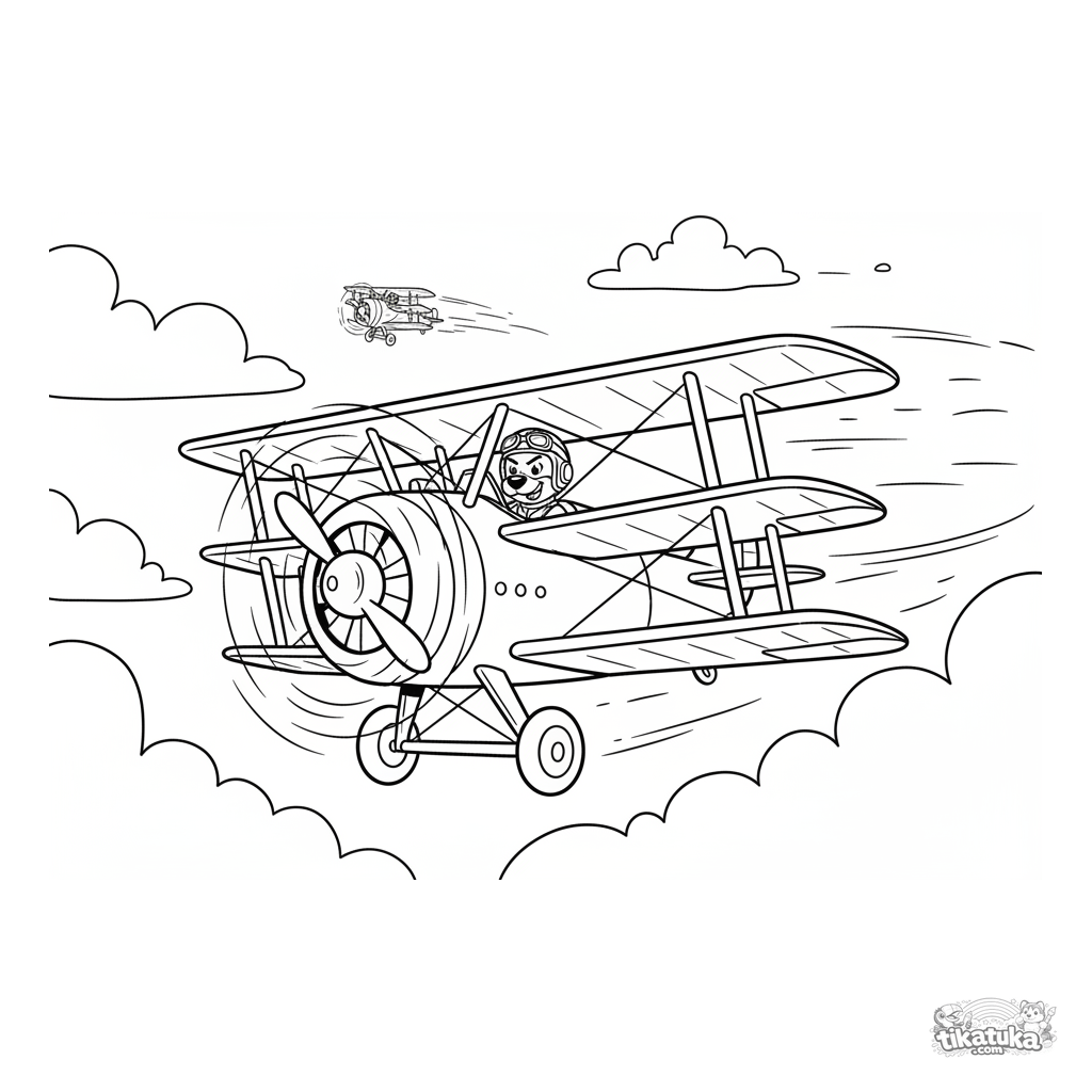 Ausmalbild eines historischen Dreideckers für Kinder 4-6. Das Flugzeug aus dem Ersten Weltkrieg führt ein scharfes Manöver zwischen flauschigen Wolken aus. Helle, dynamische Szene.