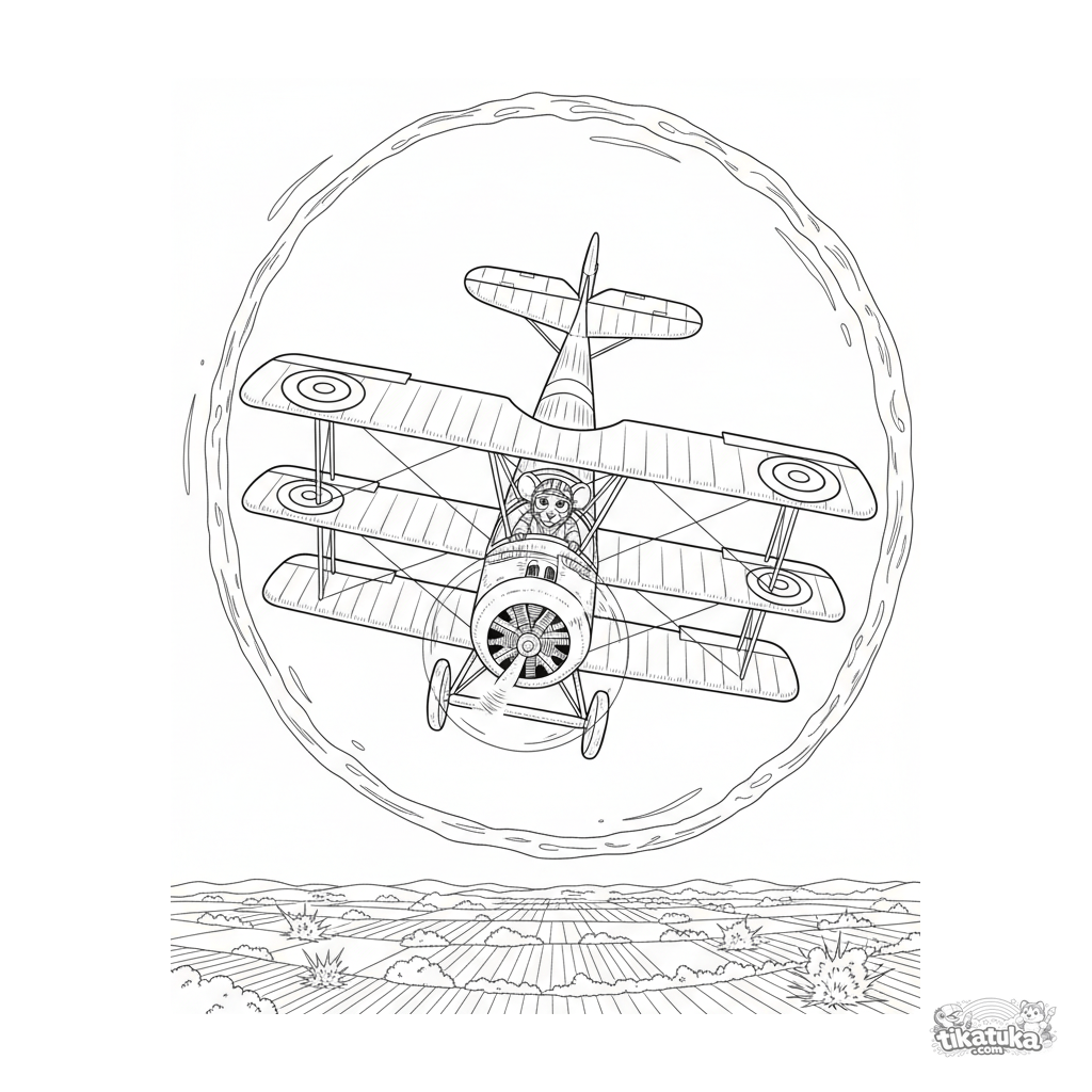 Komplexes Ausmalbild für Kinder 10-12: Ein WWI-Dreidecker führt einen Looping über einem Schlachtfeld aus. Detaillierte Linienführung, Mauspilot im Cockpit.