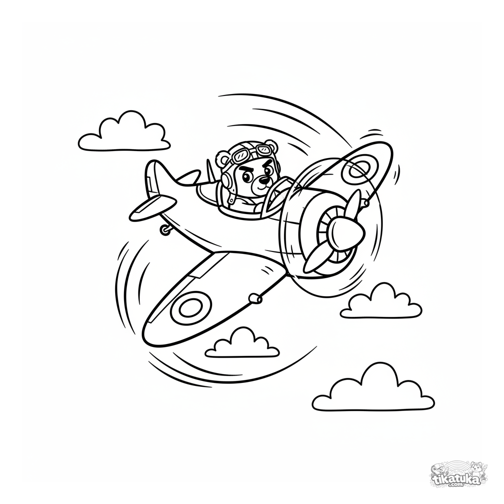 Ausmalbild eines Jagdflugzeugs aus dem 2. WK im Looping. Für 4-6 Jahre. Ein entschlossener Bärenpilot im Cockpit.