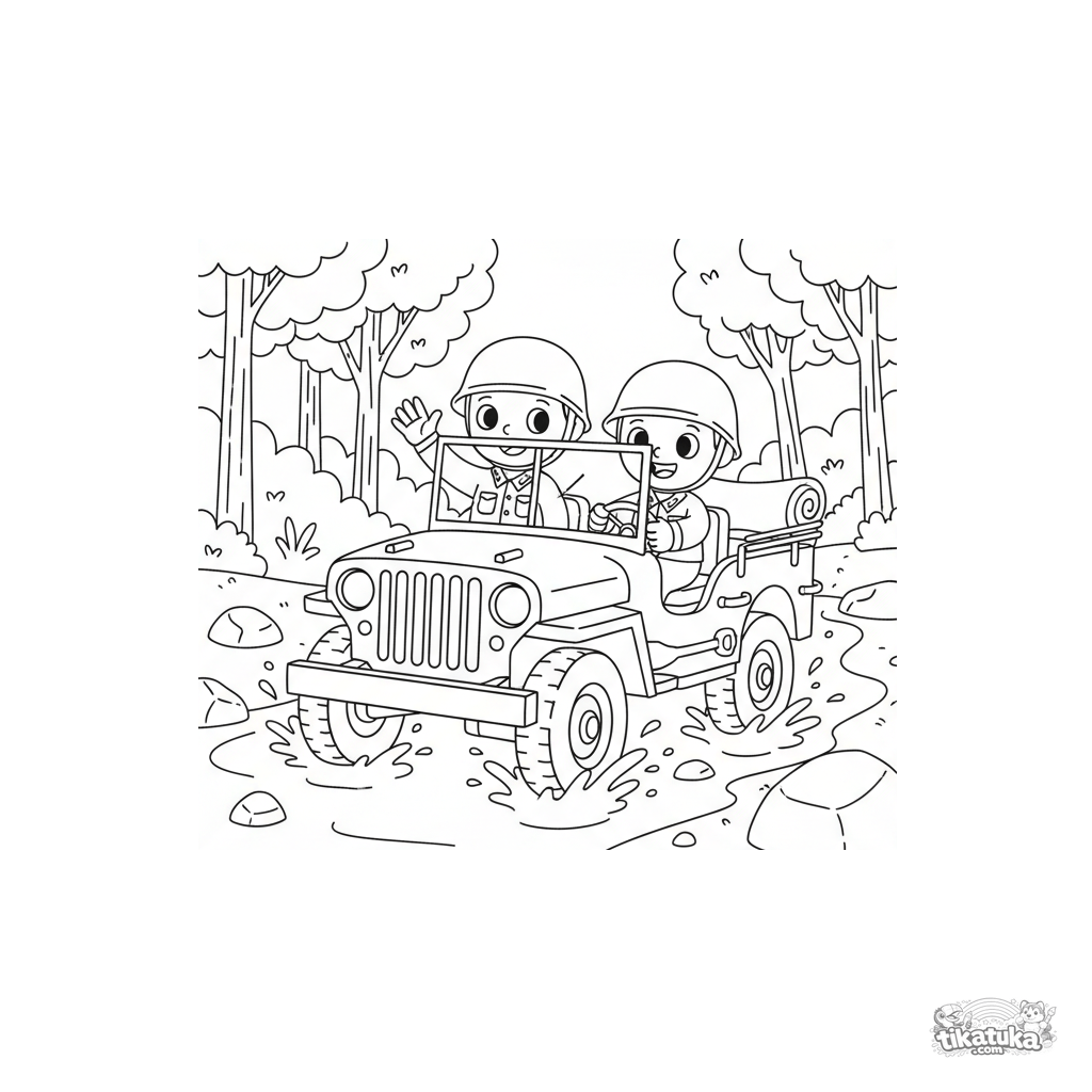 Ausmalbild eines Armee-Jeeps, der einen Waldbach überquert. Für Jungen von 4-6 Jahren. Dynamische, aber unübersichtliche Szene mit Soldaten.