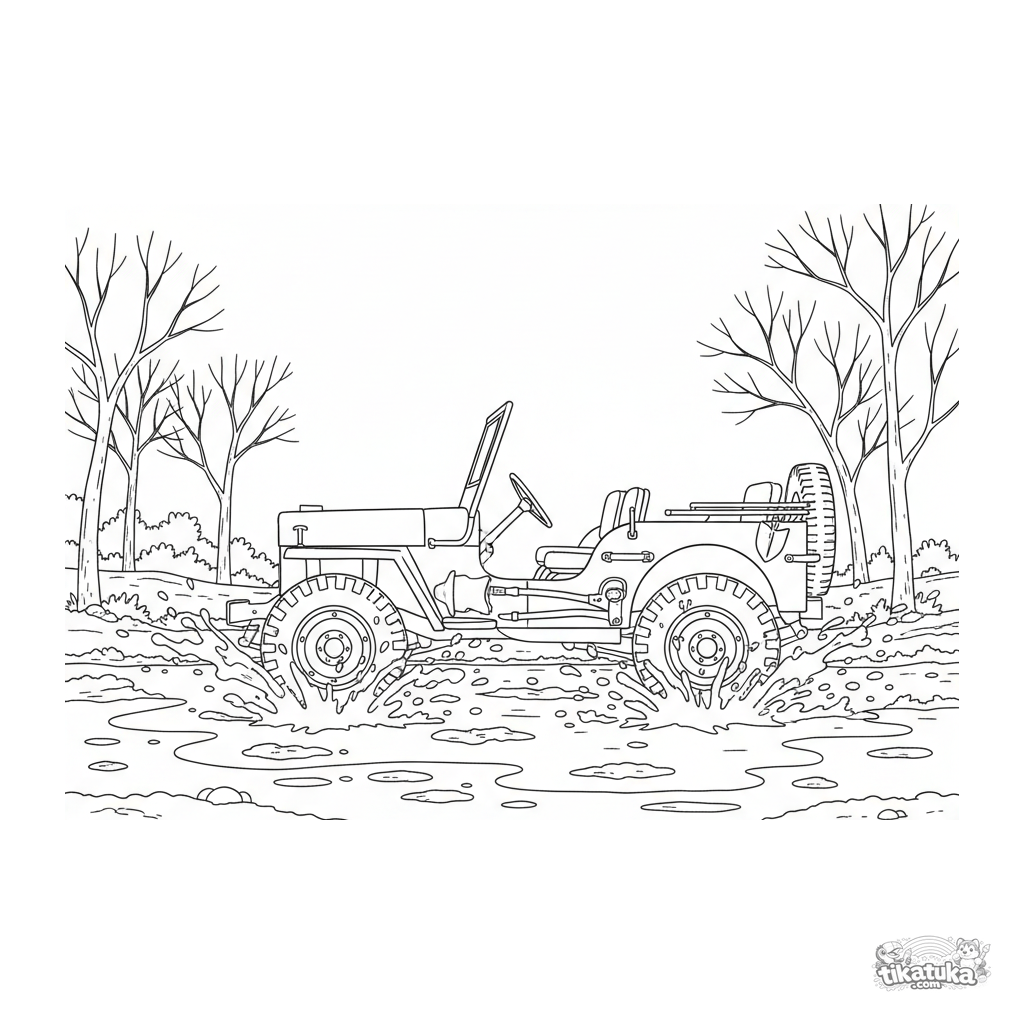 Schwieriges Ausmalbild für Jungen 7-12: ein WW2 Jeep auf einer Schlammsstraße. Hohes Fahrzeugdetail und realistischer Stil.