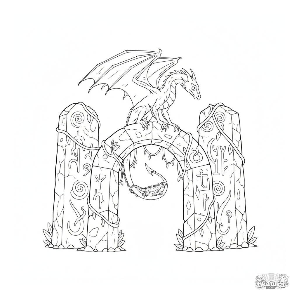 Ausmalbild für Tweens 7-9: ein flinker Wyvern thront auf einem alten Runenbogen zwischen Monolithen und beobachtet eine Eidechse. Mäßiges Detail an Architektur und Kreatur.