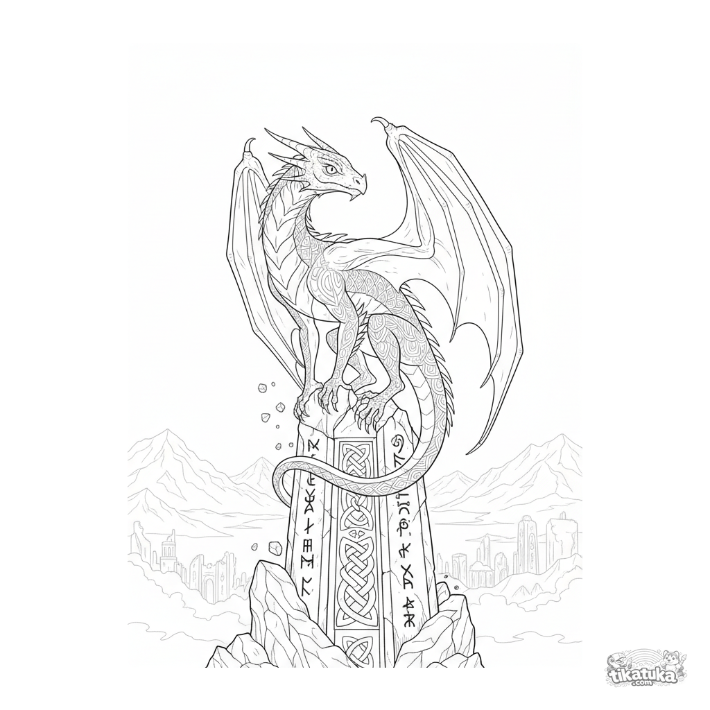 Komplexes Ausmalbild für ältere Kinder 10-12: Ein Wyvern-Späher wacht vom Gipfel eines bröckelnden Monolithen. Detaillierte Linien, Texturen von Stein und Flügeln.