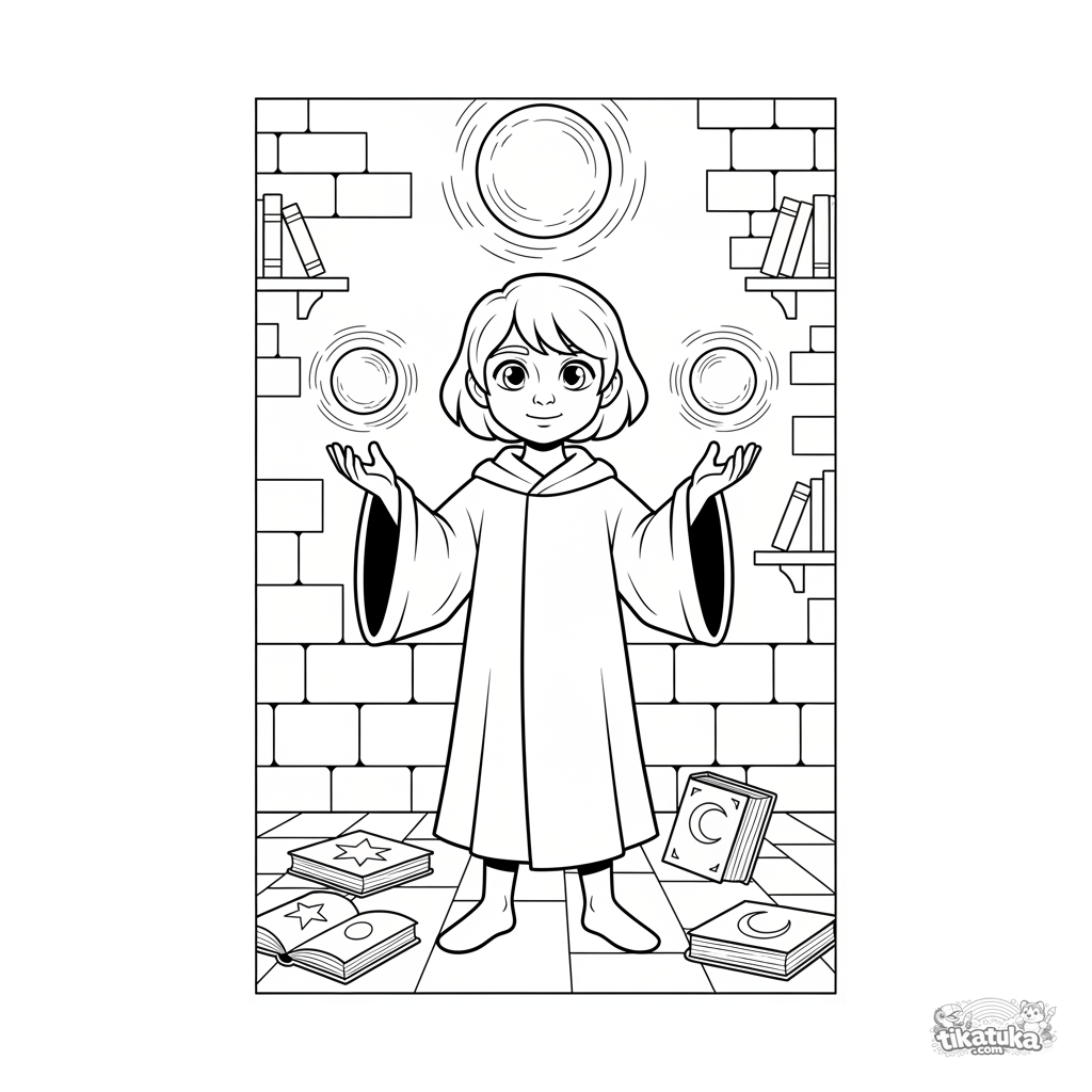 Ausmalbild für Kinder 4-6: Ein junger Zauberlehrling in einem Turm konzentriert sich darauf, drei leuchtende magische Kugeln in der Luft zu balancieren.