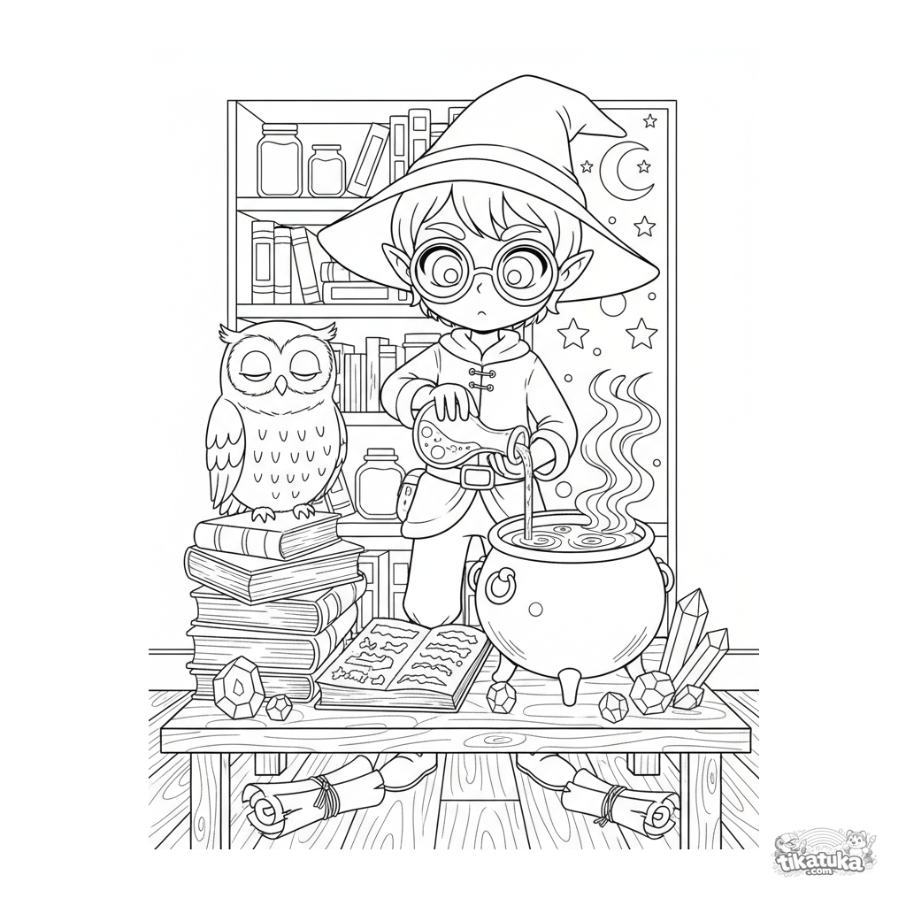 Ausmalbild für ältere Kinder 10-12: ein junger elfischer Lehrling braut konzentriert einen leuchtenden Trank in einer überfüllten Turmwerkstatt. Detaillierte Szene mit Büchern und einer Eule.