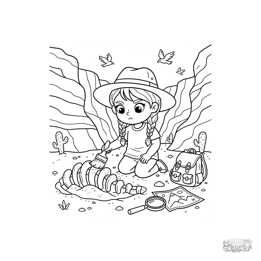 Ausmalbild für Kinder 5-8: Ein Mädchen-Archäologin legt vorsichtig einen Dinosaurierknochen in einer Schlucht frei. Eine einfallsreiche Szene zum Ausmalen.