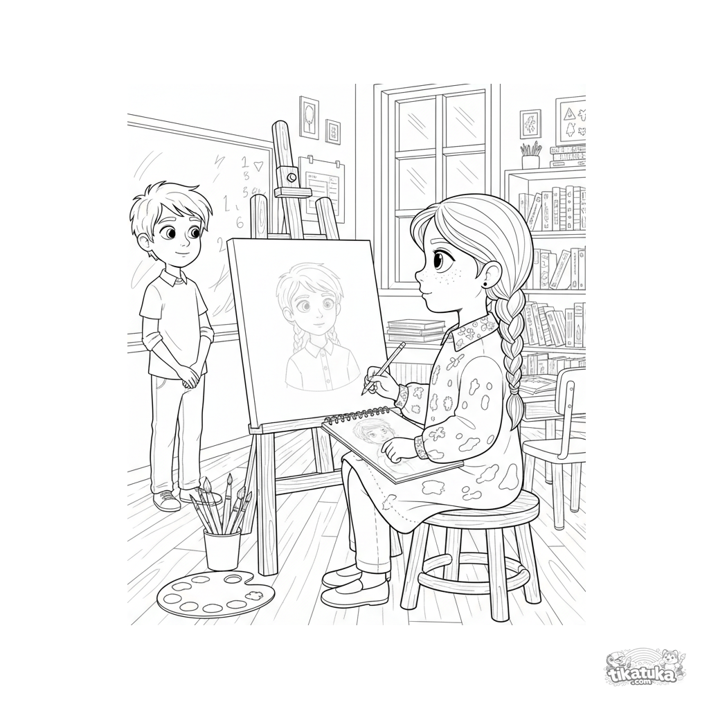 Ausmalbild für Kinder von 10-12 Jahren: eine junge Künstlerin zeichnet das Porträt eines Mitschülers an einer Staffelei im Klassenzimmer.