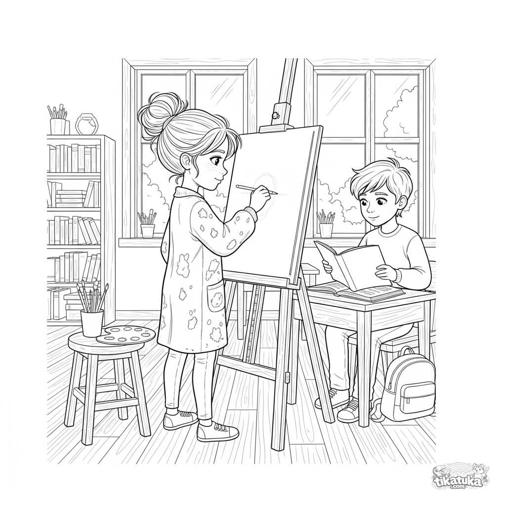 Ausmalbild für ältere Kinder 10-12: Eine junge Künstlerin zeichnet im Klassenzimmer das Porträt eines Mitschülers an einer Staffelei. Detaillierte Szene, Kunstzubehör.