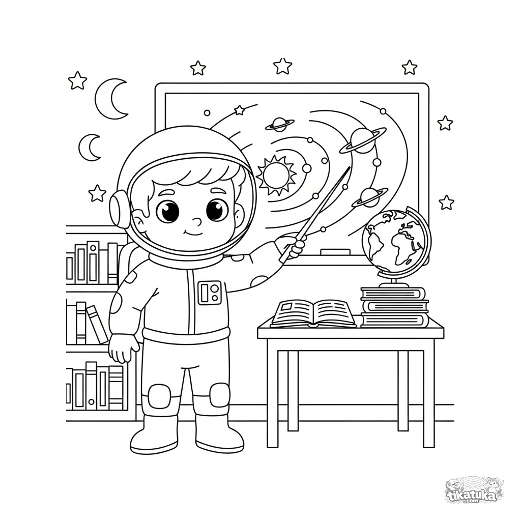 Ausmalbild: Ein junger Astronautenlehrer erklärt das Sonnensystem an der Klassenzimmertafel. Für Kinder von 7-9 Jahren. Details: Diagramm, Globus, Lehrbücher.